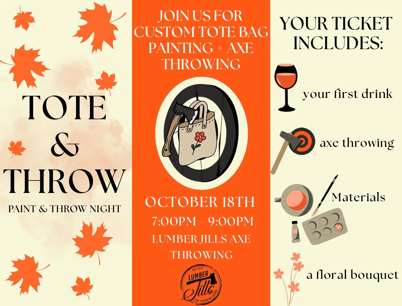 Kick off October with a night of creativity + adrenaline! Tote & Throw combines custom tote bag painting with axe throwing for the ultimate mash-up of art and adventure. Guests will design and paint their own tote bags while enjoying a drink and 30 minutes of axe throwing. No experience needed โ just bring your imagination and good vibes!