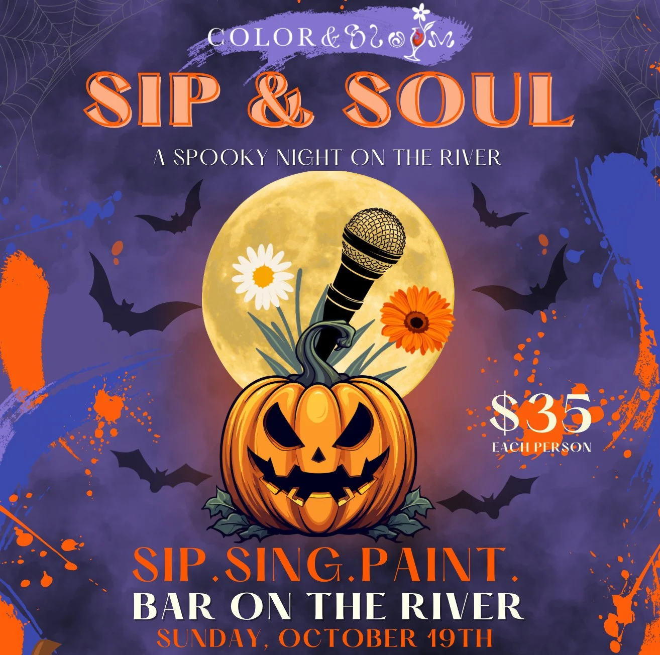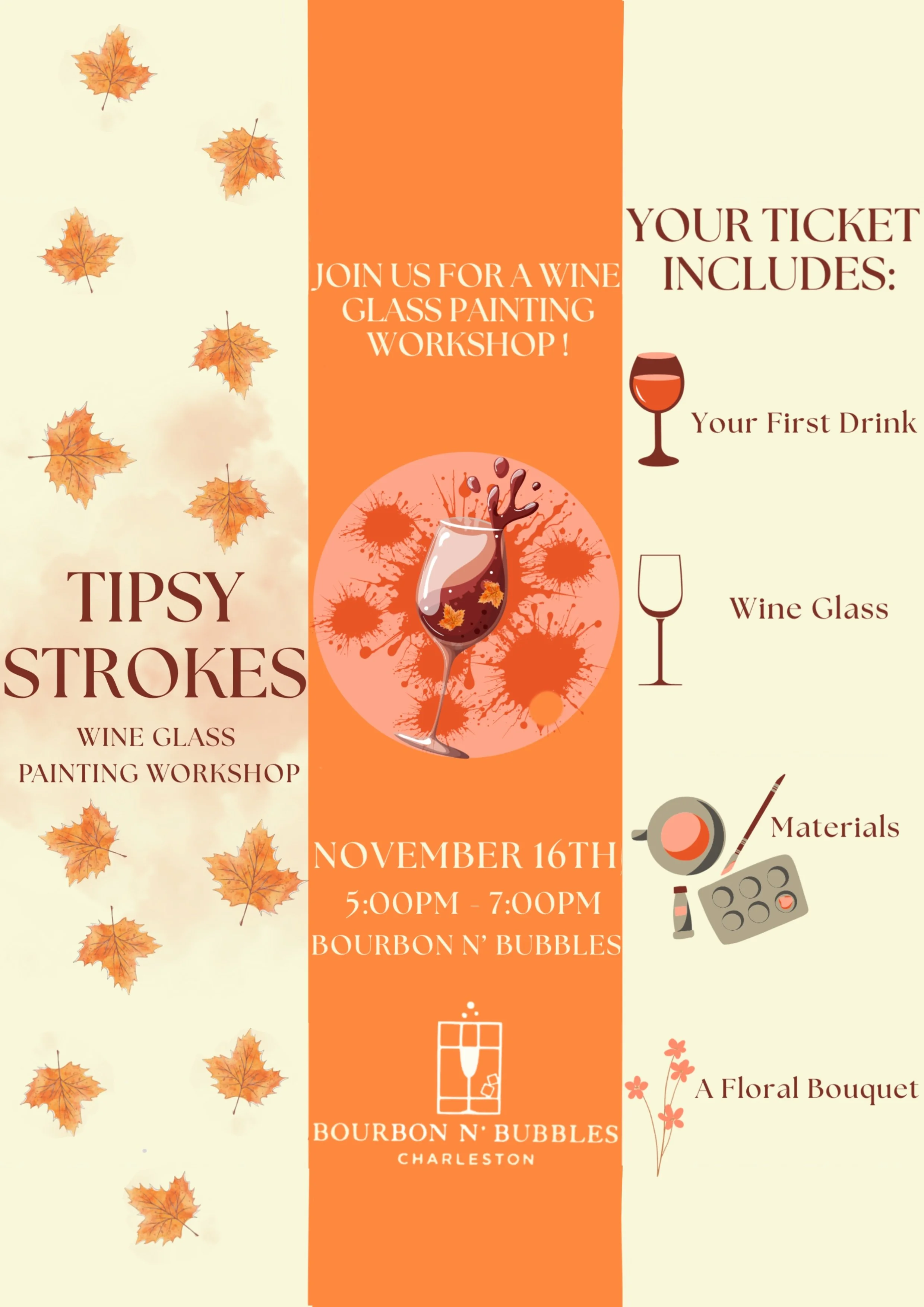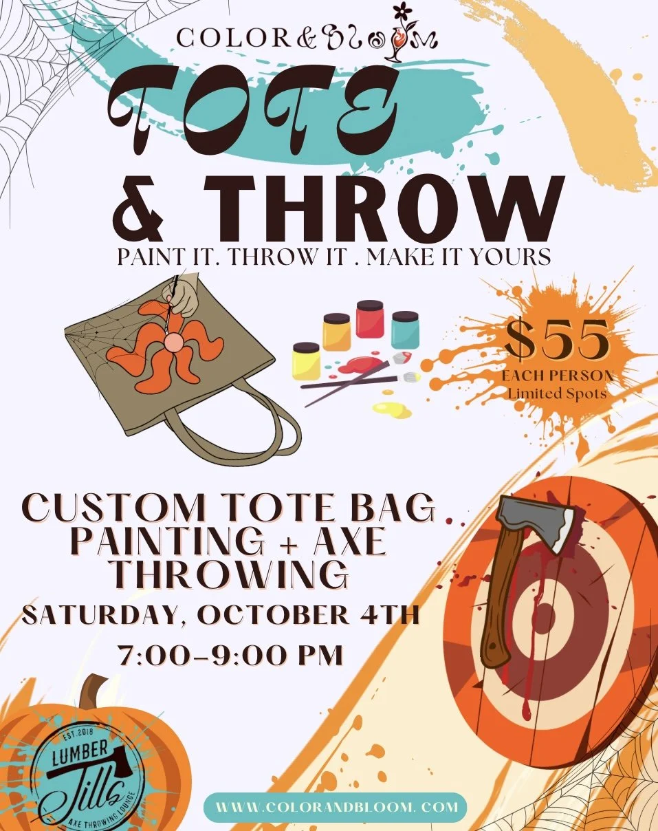 Choose a package The season of cozy vibes, fall palettes, and new memories is here — and we’ve got a full lineup waiting for you! From spooky sips to creative collabs, there’s something special for everyone this fall! Events Tote & Throw from $45.00 Sale Select Ticket Type Early Bloom Admission (5 spots only) Sharp Shooter Admission (includes drink + tote+ throw) Axes & Allies Bundle (2 guests, 2 totes , 2 drinks) Check out Added! Pumpkins & Pours from $35.00 Sale Select Ticket Type Early Bloom Admission (5 spots only) Haunted Canvas Admission (pumpkin + drink) VIP Boo Box Admission (pumpkin + drink + boo box) Bestie Boo Bundle (2 guests + 2 pumpkins + 2 drinks) Check out Added! Sip & Soul from $25.00 Sale Select Ticket Type Early Bloom Admission (5 spots only) Spooky Soul Admission (canvas + drink) Bestie Boo Bundle (2 guests, 2 canvases, 2 drinks) Check out Added! Reggae Night from $25.00 Sale Select Ticket Type Early Bloom Admission (5 spots only) Island Vibes Admission (canvas + drink) VIP Boo Box Experience (canvas + drink + Boo Box ) Bestie Boo Bundle (2 guests, 2 canvases, 2 drinks) Check out Added! Tipsy Strokes from $40.00 Select Ticket Type Early Bloom Admission → [ 5 Spots Only] Sip and Stroke Admission→ [ 1 Glass + 1 Drink ] Double Pour Duo→ [ 2 Glasses + 2 Drinks + 2 Guests ] Add To Cart Added! Paddles and Pours from $50.00 Select Ticket Type Early Bloom Rally→ [ 5 Spots Only } Paddle and Pour→ [ 1 Paddle + 1 Drink + 1 hr play ] Bestie Paddle Pack→ [2x Paddles + 2x Guests + 2x Drinks + 1 hr play ] Add To Cart Added!